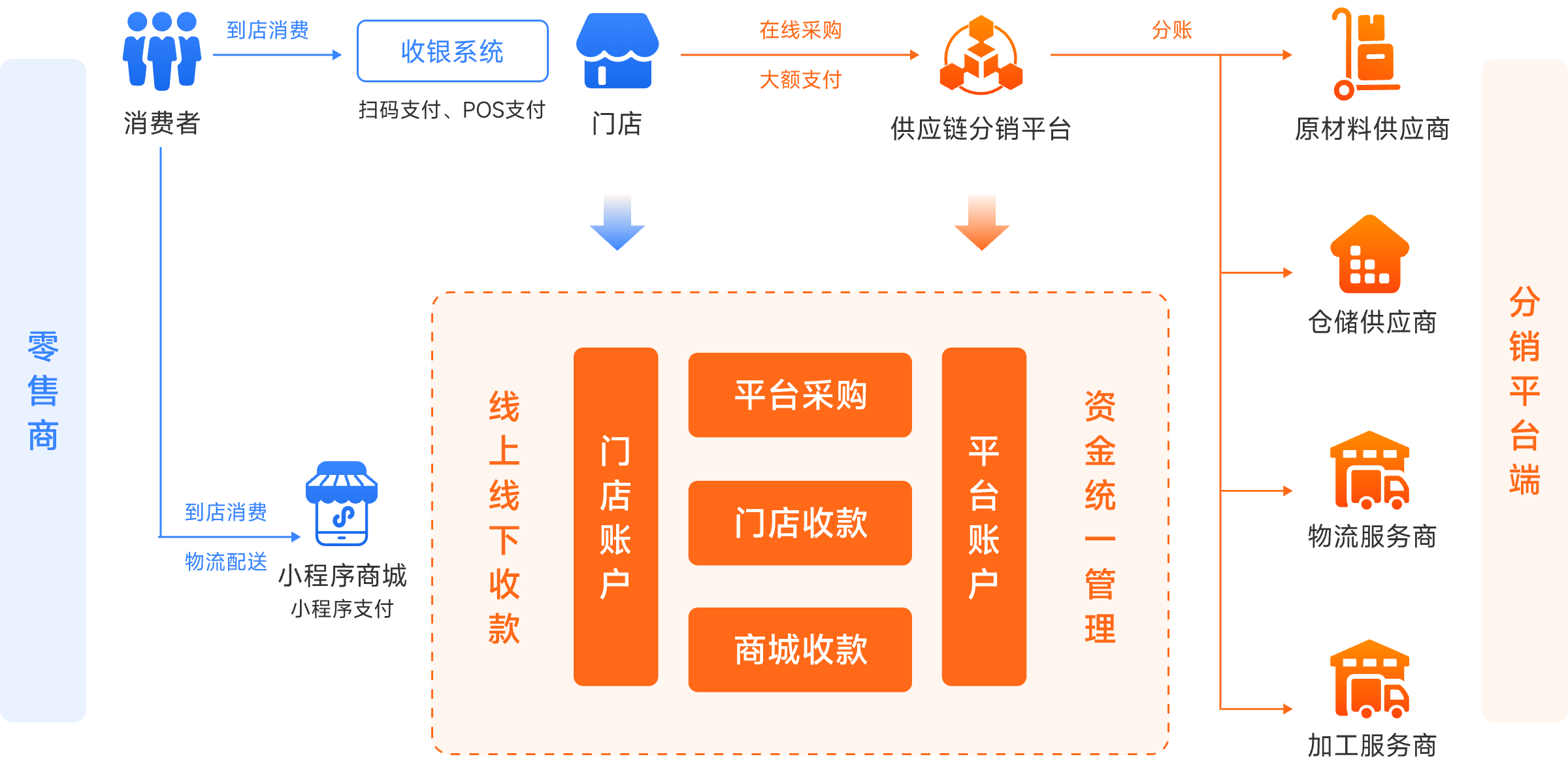 支持T1、D1、D0结算/取现时效;自定义结算周期,满足全方位结算需求,助力产业链资金流顺畅方案架构-供应链分销平台及零售一体化
